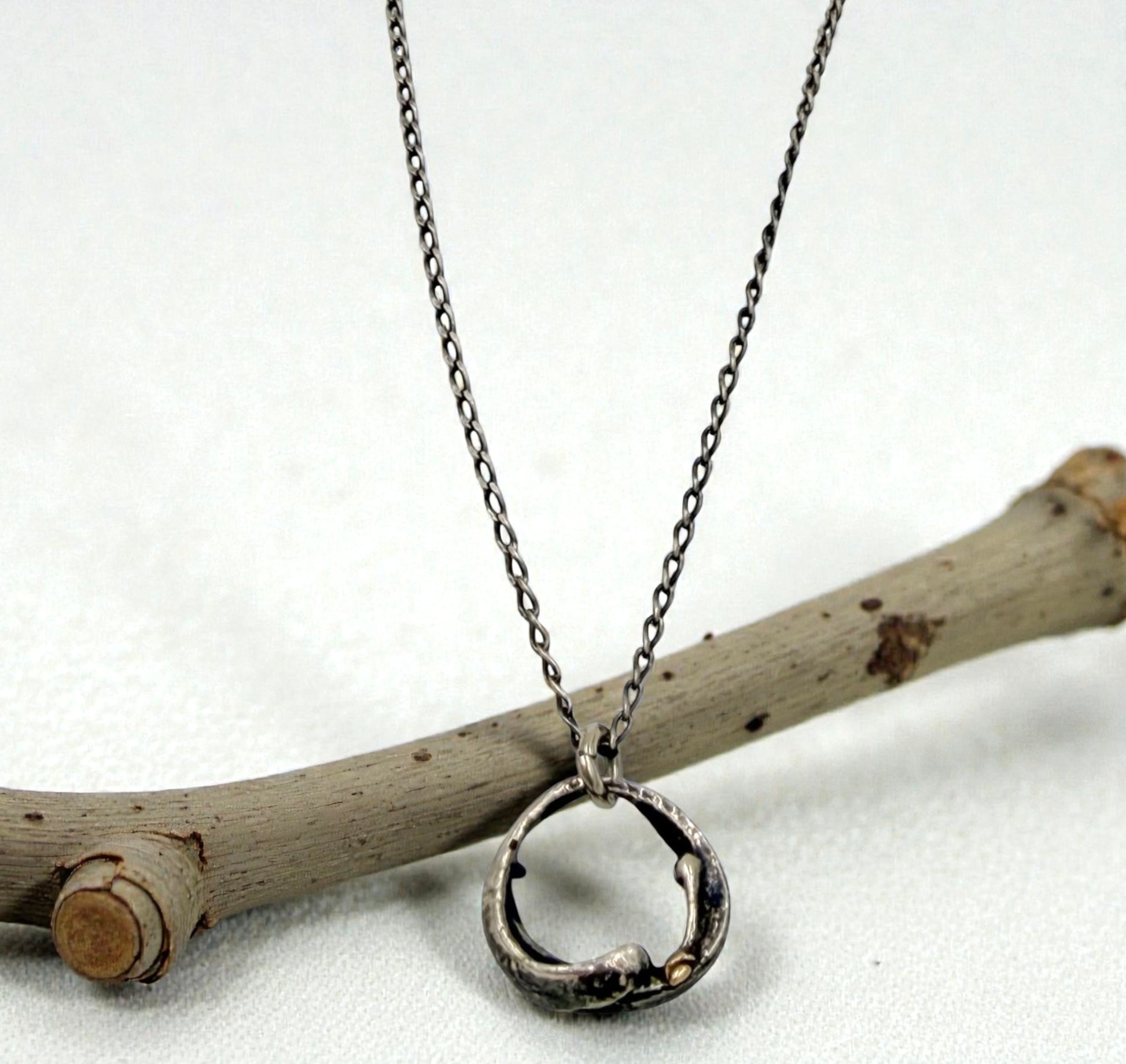 An oxidized sterling silver pendant with rich surface texture and depth. Hand-formed and a touch of 18kt gold for a sublte accent, this piece carries presence without being heavy.
