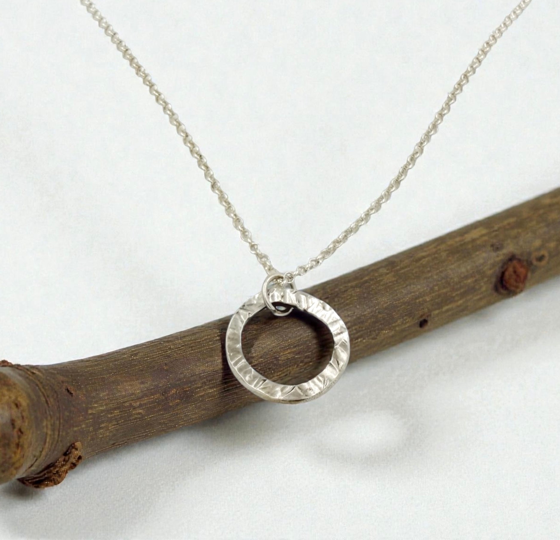 A hand-forged sterling silver circle suspended on a delicate chain. Clean, balanced, and endlessly wearable — a refined everyday piece designed to layer or stand alone.
